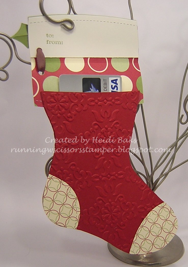 We used the Holiday Stocking die for the sock and the Stocking Accents die for the holly. We traced the gift card on the inside of the stocking, in order to put glue outside that area, which would prevent the card from falling down into the stocking. Here is the inside.