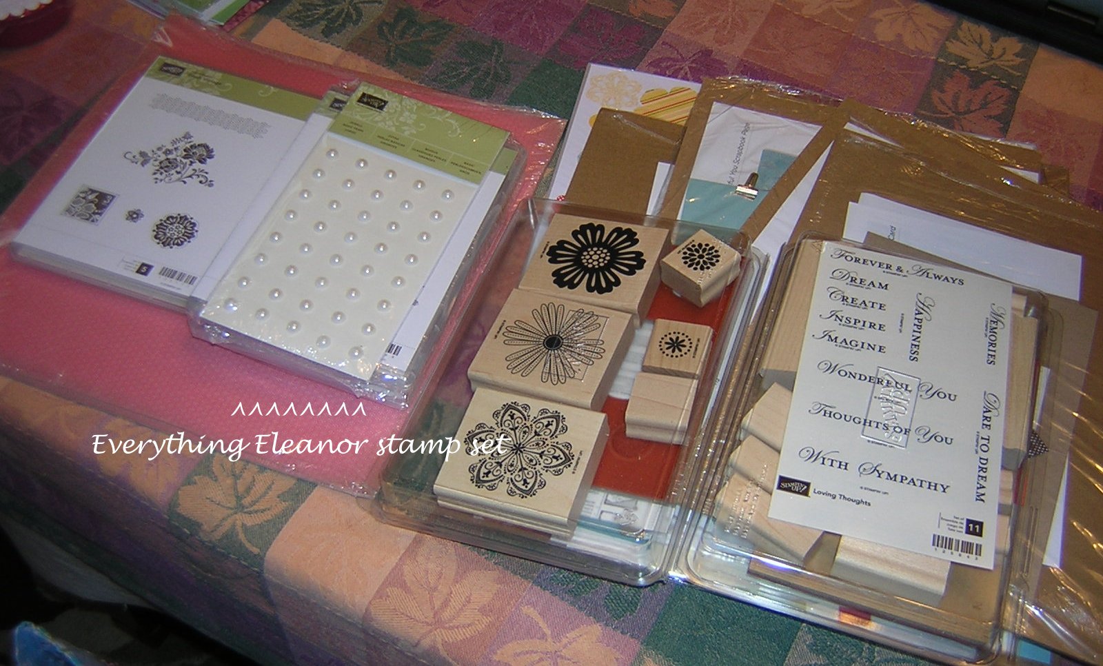 Here are the stamp sets - Fresh Vintage plus Everyday Enchantment DSP, Everything Eleanor plus large pearls, Mixed Bunch, and Loving Thoughts. Also the make & take packets are in there, which I plan to work on today.