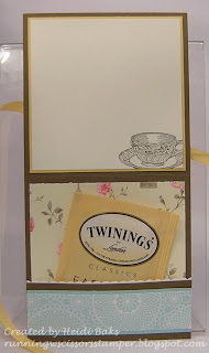Stamps: Tea Shoppe; Paper: Marina Mist, Soft Suede, Very Vanilla, Beau Chateau DSP; Ink: Marina Mist, Crumb Cake; Accessories: Early Espresso striped grosgrain ribbon, Victorian lace, Crumb Cake seam binding, Hat pin, Pearl Jewels, Sponge, Vintage Wallpaper EF, 3" Circle die, Scallop Circle #2 die, Big Shot.Then a tea bag holder card with Timeless Treasures. This one would be great to send to a sick friend.