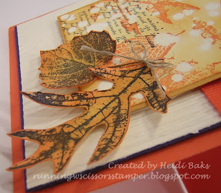 Stamps: French Foliage; Paper: Tangerine Tango, Concord Crush, More Mustard, Very Vanilla; Ink: Tangerine Tango, Concord Crush, More Mustard; Accessories: Tangerine Tango ribbon, Linen thread, Bleach, Sponges, Woodgrain EF, Big Shot, Dimensionals.
