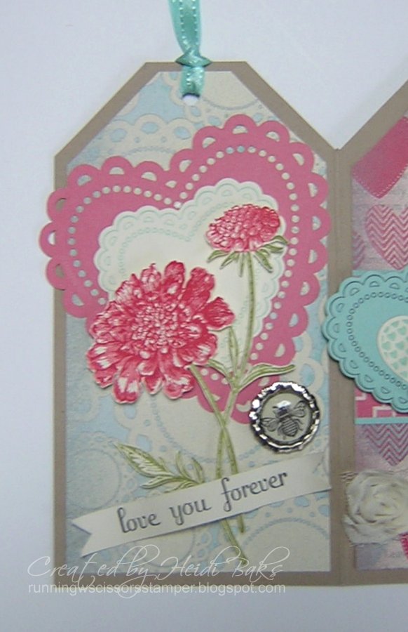 Stamps: Field Flowers, Fabulous Phrases, Hearts a Flutter, Collage Curios, Pretty Petites; Artistic Etchings; Paper: Pool Party, Real Red, Primrose Petals, Very Vanilla, More Amore Specialty DSP; Ink: Real Red, Primrose Petals, Pool Party, Old Olive, Black StazOn; Accessories: 5/8” Flower Trim, Artisan Embellishments Kit, Silver Soda Pop Tops, Crystal Effects, Sycamore Street Pool Party Ribbon (SAB), Rhinestone jewels, White baker's twine, Petite Curly Label Punch, ½-inch Circle Punch, Heart-to-Heart punch, Scalloped Heart of Hearts Embosslits Die, Hearts a Flutter Framelits Dies, Tasteful Trim Bigz XL Die, Big Shot, Dimensionals.