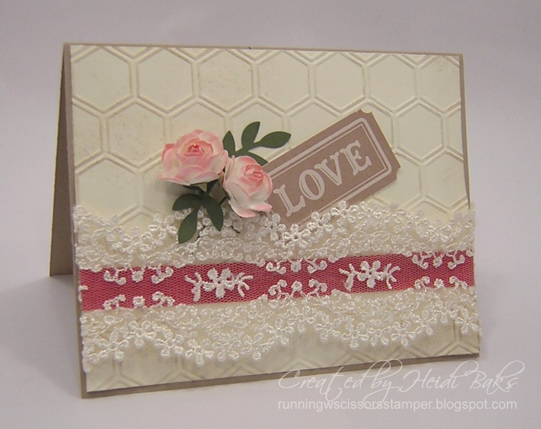 I grabbed the double-layer-ribbon-and-lace idea from my Leadership buddy Kay.  She makes beautiful cards, by the way!  I always blown away with her samples at shoebox swaps.