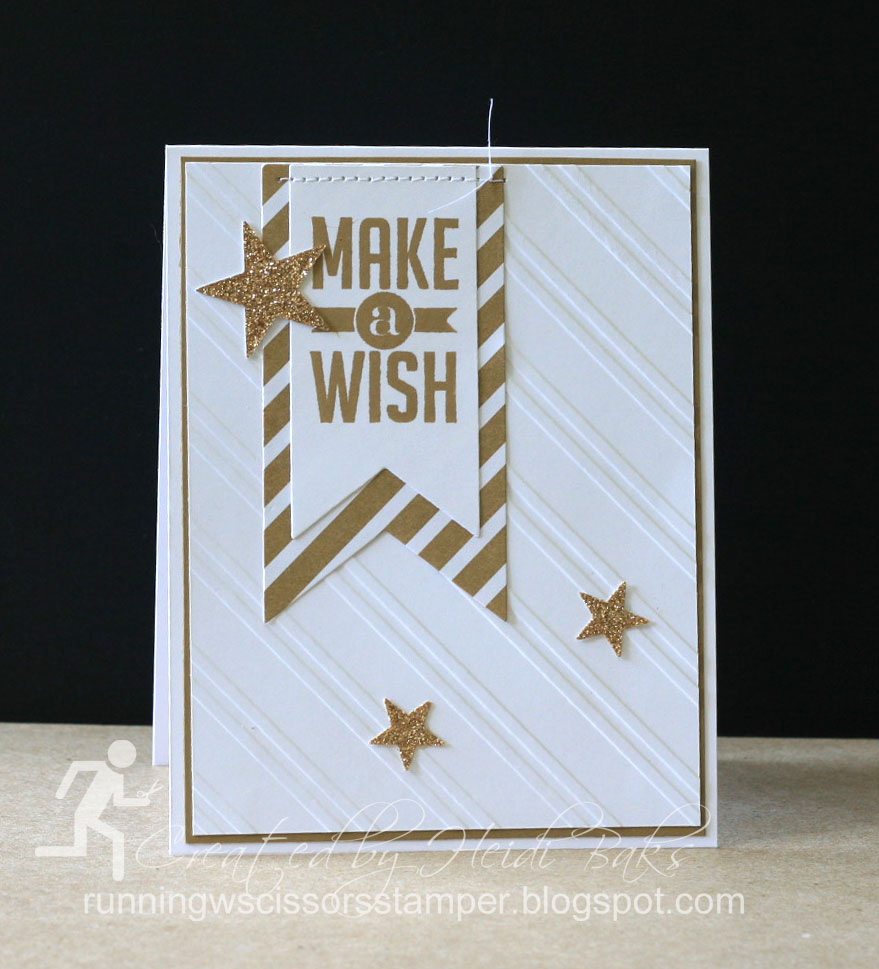 Stamps: Perfect Pennants; Paper: Baked Brown Sugar, Whisper White, Lullaby DSP, Champagne Glimmer; Ink: Baked Brown Sugar; Accessories: Itty Bitty Accents punch pack, Stylish Stripes EF, Banners framelits, Stars #2 die, Big Shot, Sewing machine, Thread.