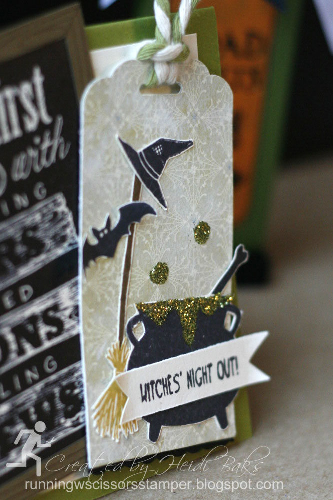 Summer Tags, although I went with a Halloween theme. For various coloring media, I used gesso to lighten up the tag, dye inks, and glitter.