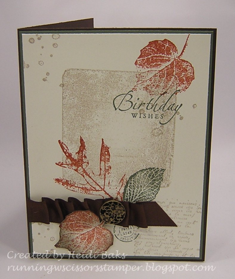 Stamps: French Foliage, Sincere Salutations; Paper: Always Artichoke, Crumb Cake, Early Espresso, Very Vanilla; Ink: Crumb Cake, Cajun Craze, Always Artichoke, Early Espresso; Accessories: Early Espresso baker's twine, Antique brad, Early Espresso satin ribbon, Sponge, Dimensionals, Sticky Strip.Emboss Resist - Our other technique, using Emboss Resist, gives a nice soft look and was a favorite.