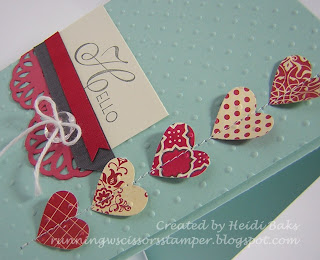 Stamps: Lacy & Lovely; Paper: Pool Party, Primrose Petals, Real Red, Very Vanilla,Candlelight Christmas DSP, Love Letter DSP; Ink: Basic Gray; Accessories: Vintage Faceted button, White baker's twine, 1/2" Striped Black/Gray satin ribbon, Perfect Polka Dot EF, Hearts Collection framelits, Delicate Doilies die, Big Shot, Sewing machine, Thread, Dimensionals.
