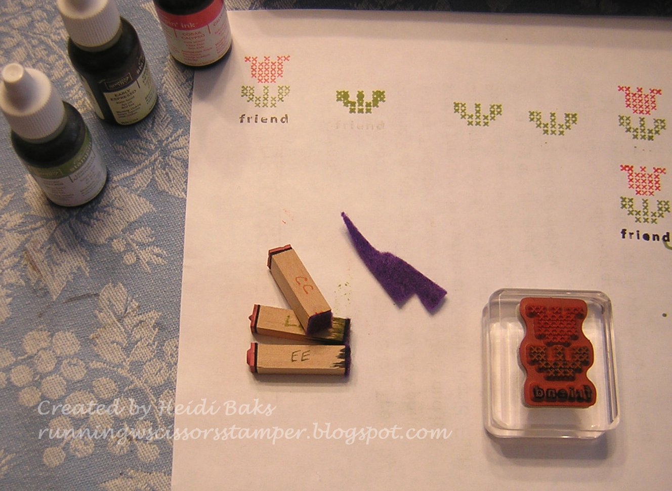 I cut very small squares of felt to glue onto the end of these long skinny wood blocks. I used Tombo multipurpose liquid glue. Once glued and dried a bit, wet the felt with one drop of reinker. I found more than one drop was WAY too much.